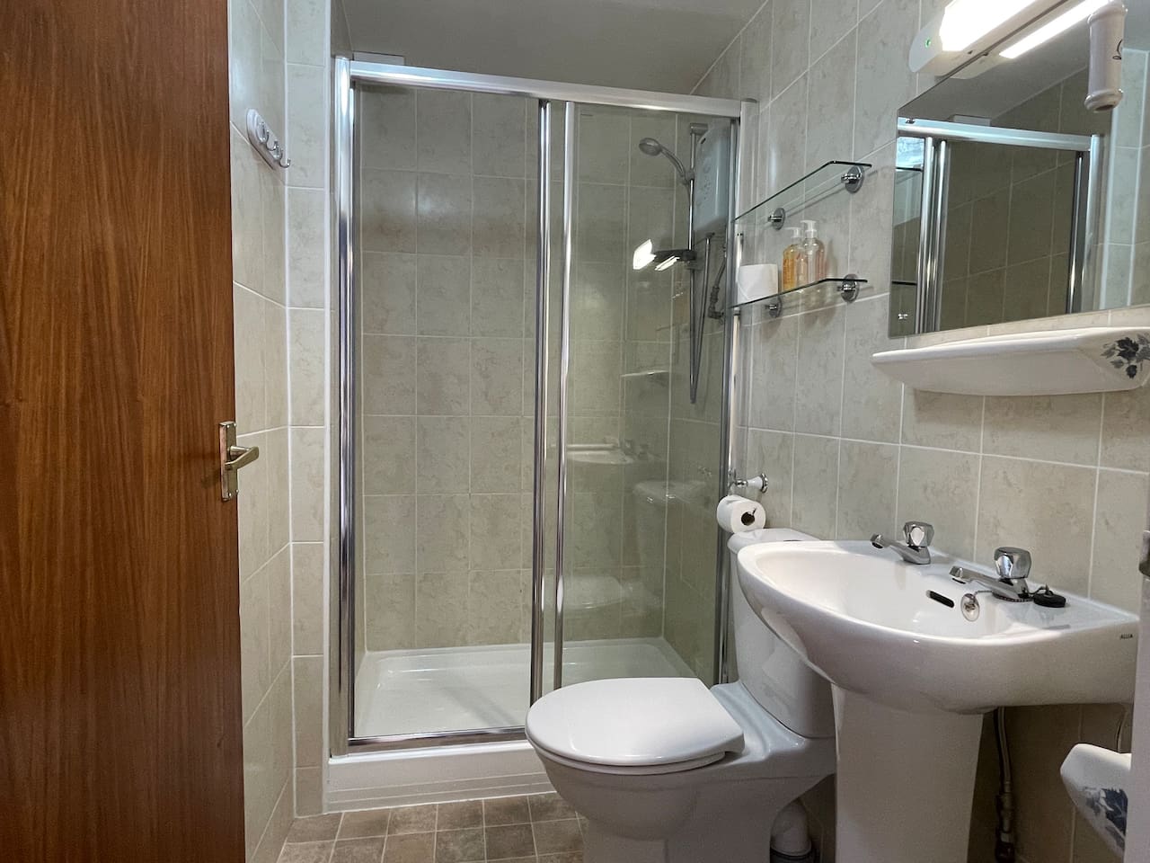 It features a comfortable double bed, along with a dressing table and mirror, plus a corner chair where you can sit and unwind. The private ensuite bathroom includes a shower, keeping things simple and practical.
